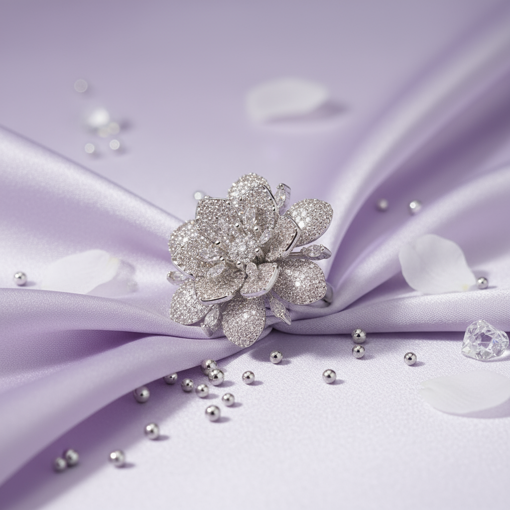 It features a silver design, with a three-dimensional floral motif fully inlaid with zircons, petals layered in order. It exudes an elegant and luxurious vibe, with zircons shining together in details, showcasing exquisite craftsmanship.