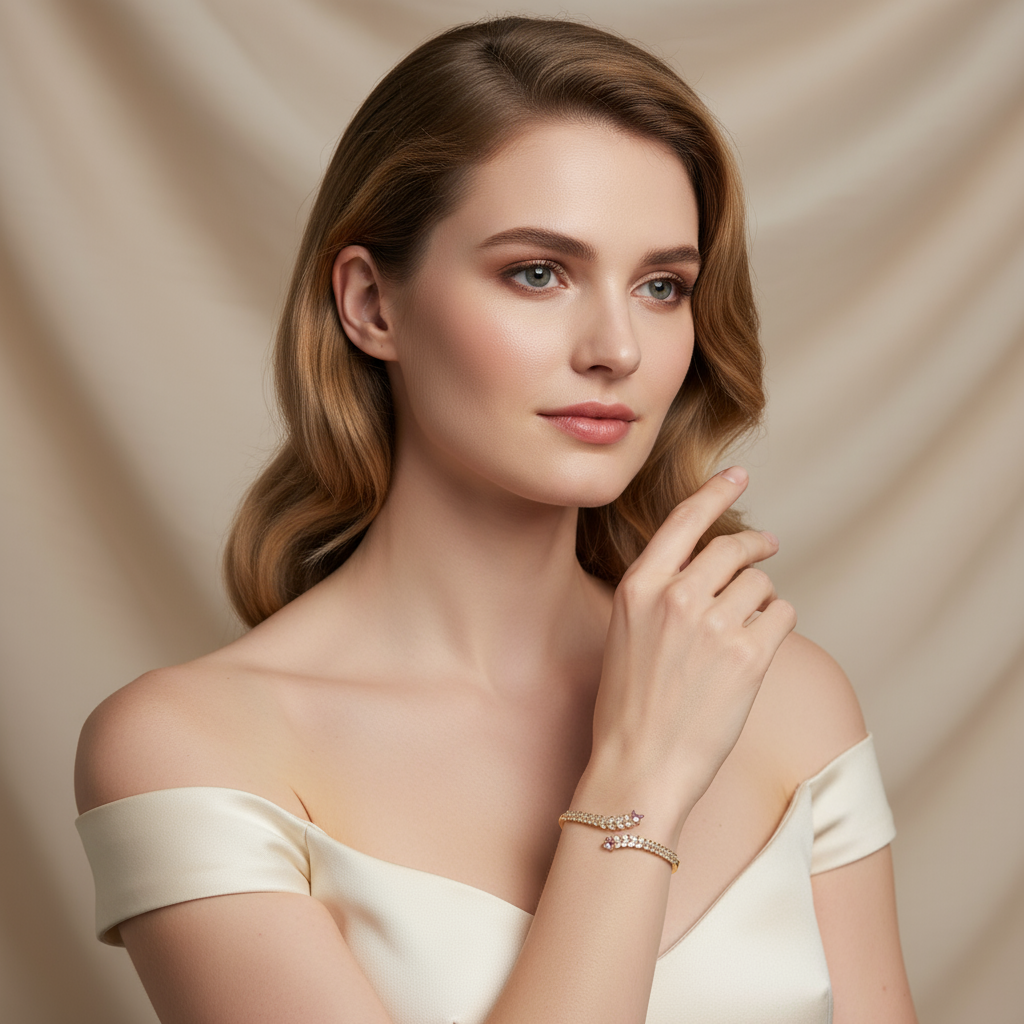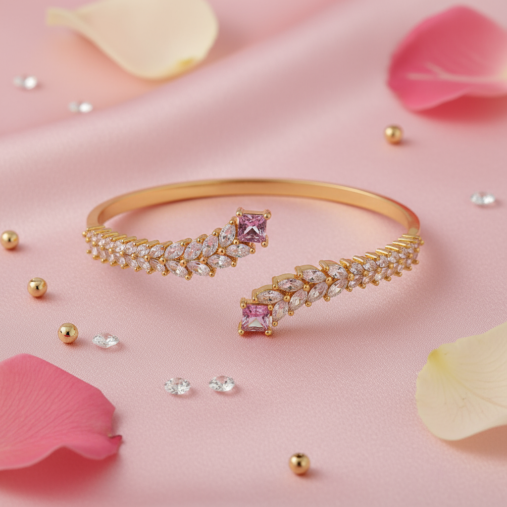 It has an open design, with a copper base plated in gold. Decorated with wheat ear-shaped bands of marquise-cut zircon and accented by square pink zircon stones, it exudes an elegant, dynamic, and vintage luxurious vibe.