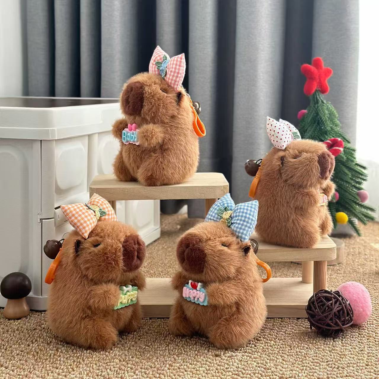 It features brown fluffy capybara designs, decorated with checkered or polka-dot bows. Some hold signs like “Baby” and “Happy”, equipped with bell clasps. With soft fur and cute expressions, they come in various styles, serving as lovely charms.