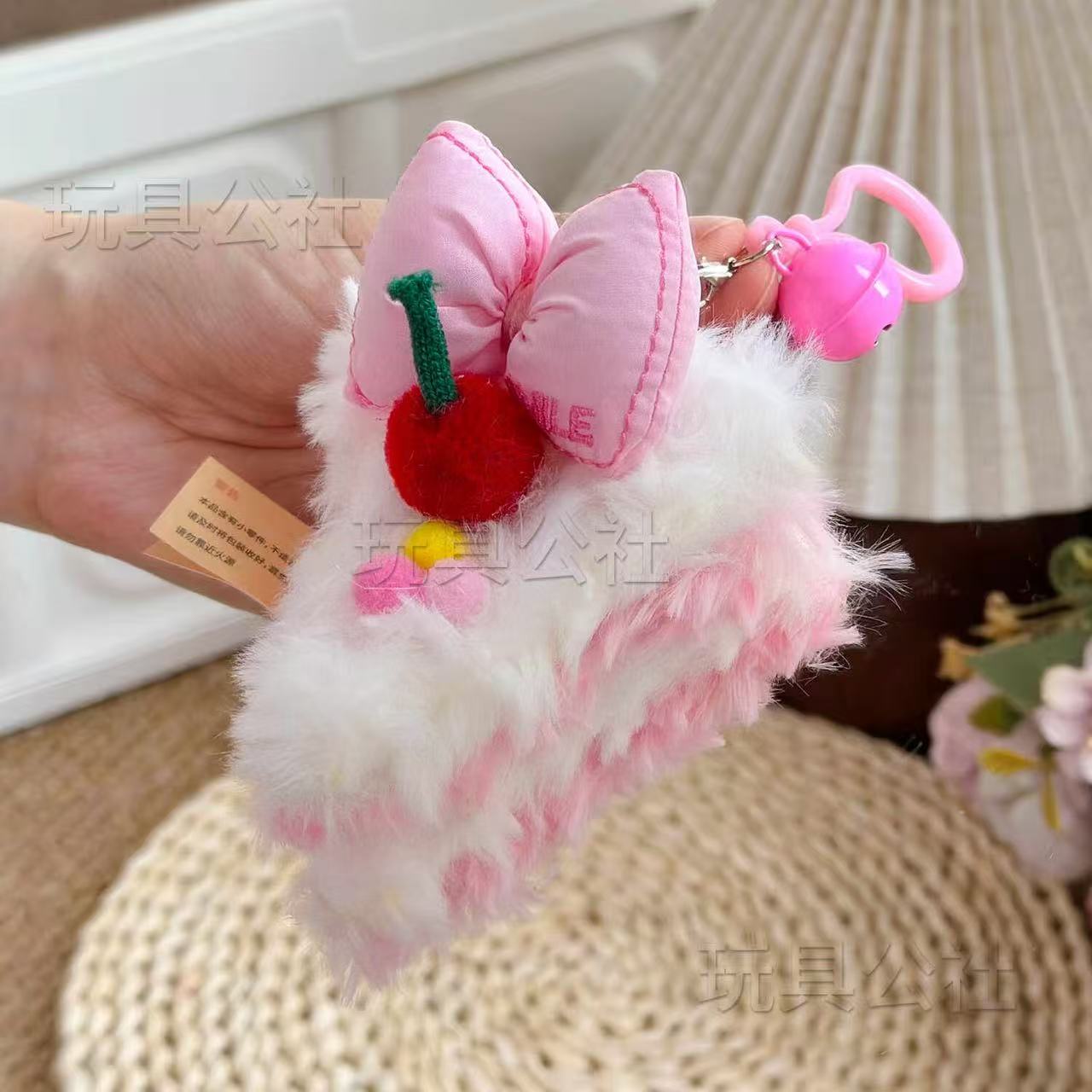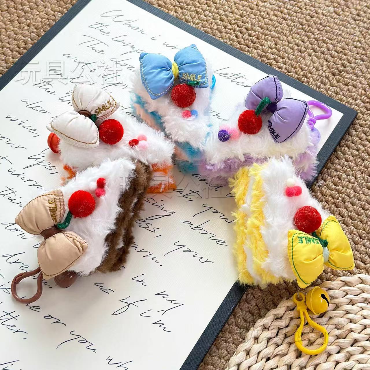 Designed as triangular cake slices with layered fluffy texture, available in colors like orange, blue, purple. Topped with colorful bows with “SMILE”, cherry pom-poms, and hooks or bells. It’s cute like dessert and serves as a charm.